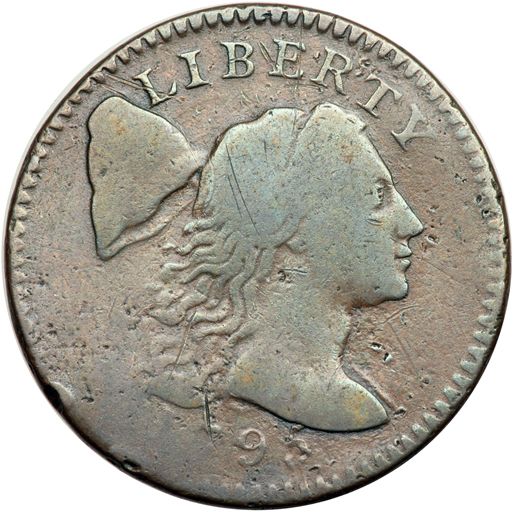 1795 S-77 R3 Plain Edge VG10. Glossy steel brown with slightly lighter brown toning covering the protected areas and darker steel toning on the highpoints. Smooth and attractive, void of any trace of corrosion or verdigris. There are a few tiny contact marks on the lower half of the obverse, including a dull rim nick left of the lowest curl, and a few light rim bruises on the reverse, the strongest of these above TE in STATES. MDS with swelling at STA that weakens those letters and causes some weakness at the opposing 1 in the date. Otherwise the date and legends are complete and easily readable.