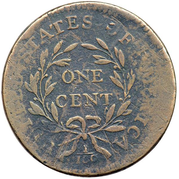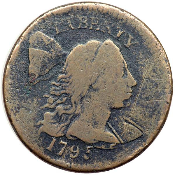 1795 S-78 R1 Plain Edge G6. Double Struck with Rotation. A few points sharper with microscopic roughness covering the fields and protected areas plus a few hairline scratches, mostly on the reverse. No verdigris and the scratches blend into the natural toning. The only other defects are a few light rim bruises, strongest at the top of the cap. Rather glossy steel brown and light chocolate with dark olive brown toning in the protected areas. Double struck with a 20-degree rotation between the impressions. Strong evidence of the two strikes shows at the bust and cap. The top of an extra "5" is visible is clearly impressed on the bust tip of the dominant strike. A neat mint error. Weight 173.3 grains.
