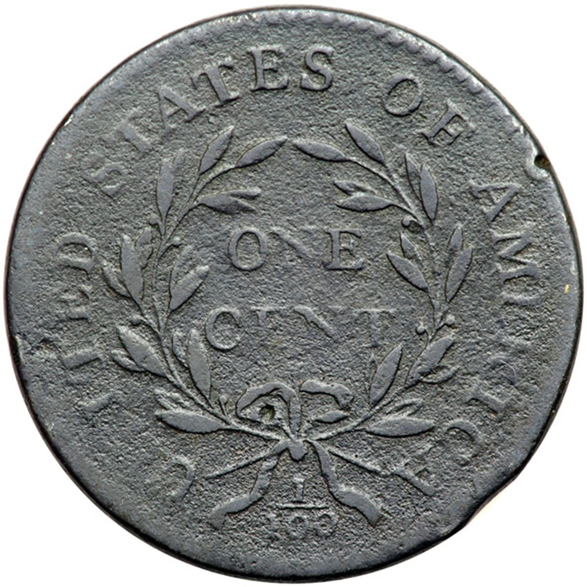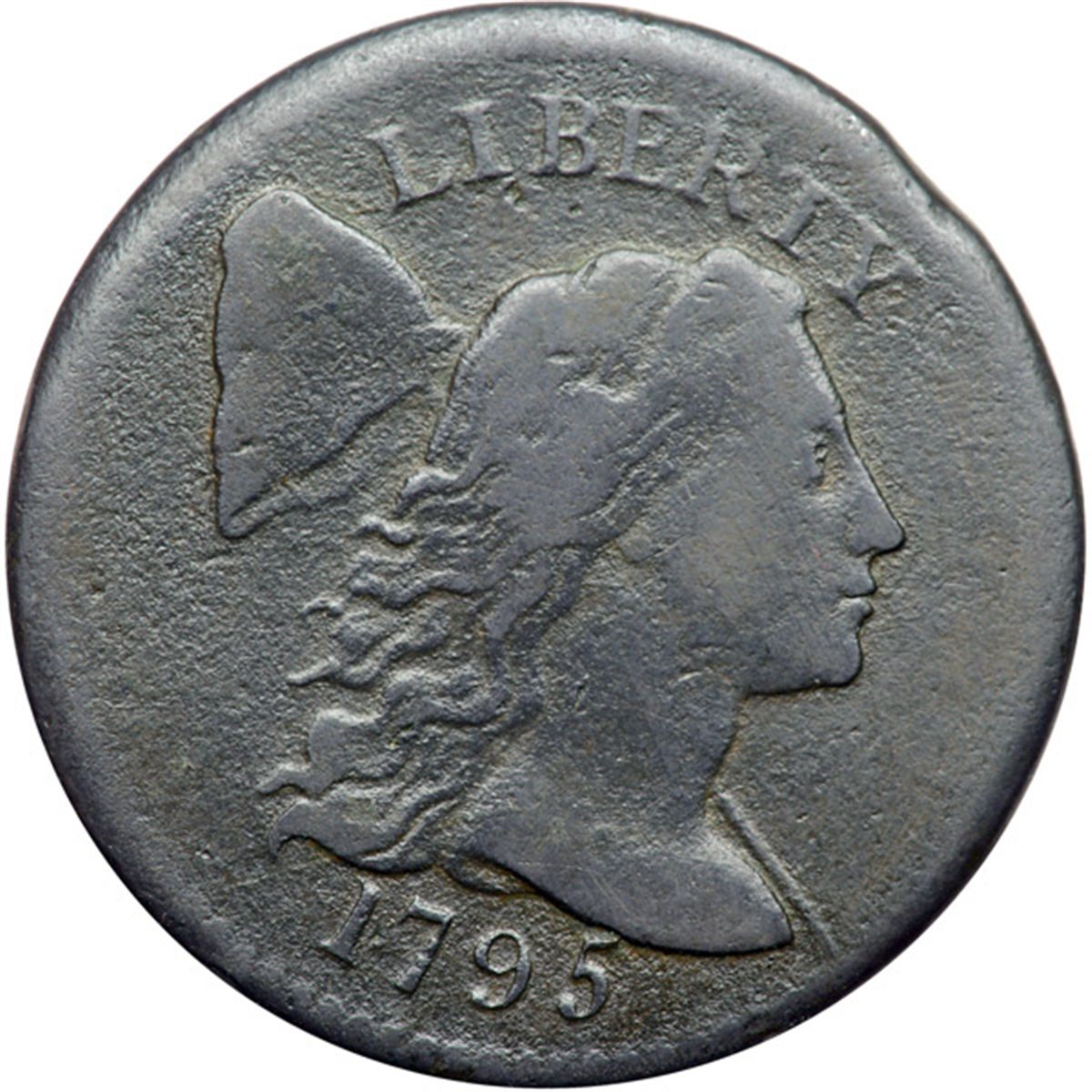 1795 S-78 R1 Plain Edge VG7. Clipped Planchet. Sharpness F12 but covered with uniform microscopic granularity under a rather glossy dark olive patina. No verdigris, and the only mark is a small nick under the right foot of the I in LIBERTY. The date is bold and the legends are clear. MDS showing very subtle swelling in the obverse fields. A small, curved planchet clip is located above TY in LIBERTY and the opposing CA in AMERICA.