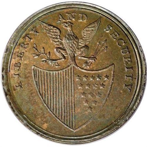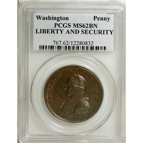 <B>Undated PENNY Washington Liberty & Security Penny MS62 Brown PCGS.</B></I> Baker-30. Although designated as brown by PCGS, ample orange-red iridescence outlines design elements. The obverse field and portrait are toned olive-brown. Nicely struck and devoid of mentionable contact. The edge disturbances are as made and diagnostic of Baker-30. Listed on page 80 of the 2008 <I>Guide Book.</B></I> Population: 10 in 62 Brown, 33 finer (12/07). <BR><BR><b>Shipping:</b> Coins & Currency (<a target="_blank" href="http://www.heritageauctions.com/common/shipping.php">view shipping information</a>)