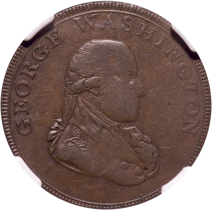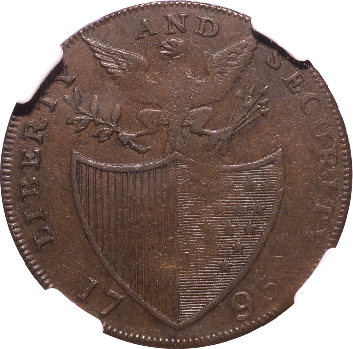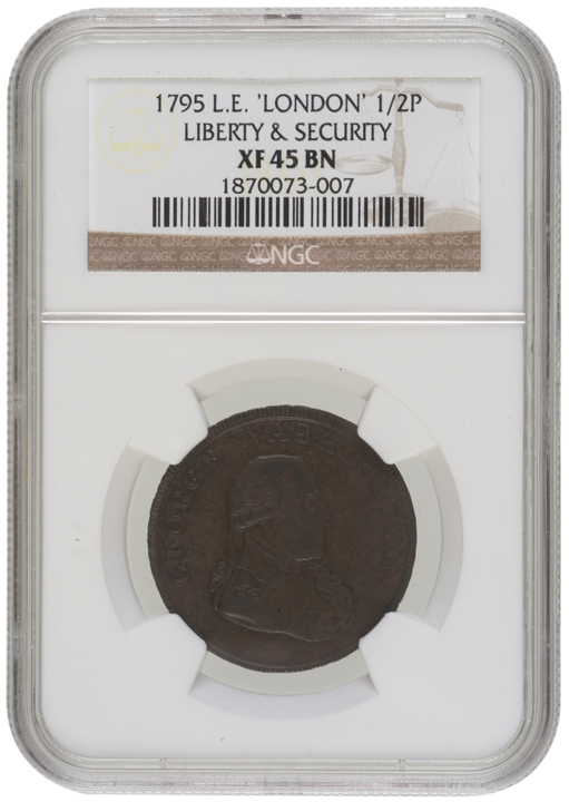 1795 Washington “Liberty and Security” Halfpenny. “LONDON” Edge. Baker-31. Whitman-11015. NGC graded Extremely Fine-45 Brown.
