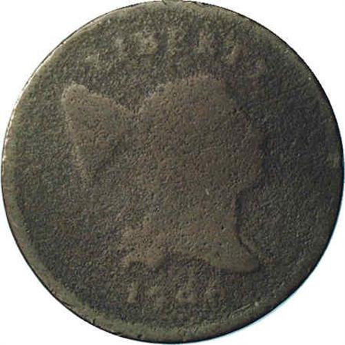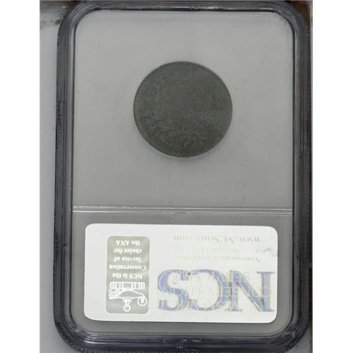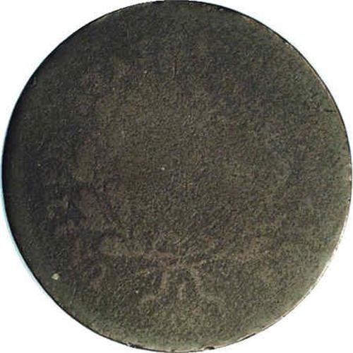 <B>1796<1/2 C> With Pole. C-2, B-2, R.4. Die State 1--Corroded--NCS. AG Details. AG3 EAC.</B></I> With pole; Triplet at F (although not visible on this example). 69.8 grains. Only one die state is listed by Manley. The surfaces are too rough to determine the Breen Die State. This date is the key to the entire series of business strike half cents, and it is always in demand, regardless of grade. All of the basic obverse design is visible with a partially defined rim. Only the left side of the reverse is visible, from the wreath outward. Triple leaf clusters beneath both IT and ED, along with a berry next to the upper triplet provide conclusive evidence that this is from 1796 half cent dies, and is not a 1795 with a distorted date. The surfaces are heavily porous, causing some of the remaining details to be slightly distorted. Both sides are generally dark olive-brown with lighter brown color on those devices that remain.<BR><I>Ex: Russell (8/1967).</B></I> Envelope Included.