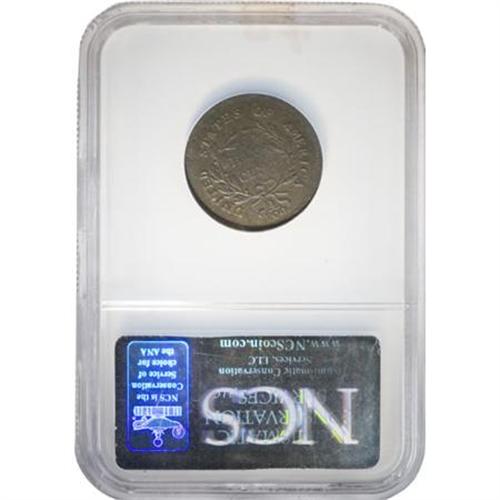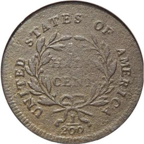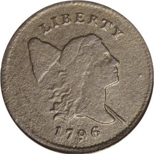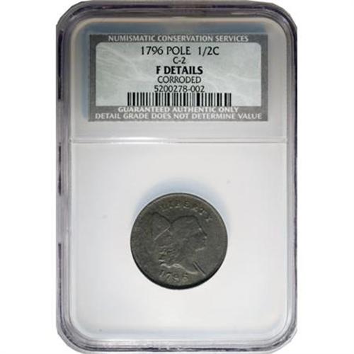 <B>1796 1/2 C With Pole--Corroded--NCS. Fine 12 Details.</B></I> C-2, B-2, R.4. On November 24, 1796, Nicholas Way submitted a statement of the value of copper coins issued from the commencement of the Mint, to the day of his report. From January 1 to March 31, 1796, the Mint issued 109,000 half cents; from April 1 to June 30, the total was 5,090 pieces; and from July 1 to November 24, the total was 1,390 pieces. <BR> Today, it is believed that only the last amount, 1,390 coins, was the mintage of those pieces actually dated 1796. However, the old 3% survival rule created by Walter Breen would only yield a little over 40 survivors for both varieties. Alternatively, the total for the last three quarters of the year, 6,480 coins, would yield about the right number of survivors at a 3% rate; about 195 coins. Another scenario is a much higher survival rate, say 10% or 139 survivors, also well within current rarity ratings.<BR> This piece has smooth, lightly corroded deep olive surfaces with hints of steel and tan on both sides. A small scrape is evident over the first S in STATES, but otherwise the surfaces are free of problems. EAC 6.<BR><BR><B>Coin Engraver:</B> John Smith Gardner<BR><BR><b>Shipping:</b> Coins & Currency (<a target="_blank" href="http://www.heritageauctions.com/common/shipping.php">view shipping information</a>)