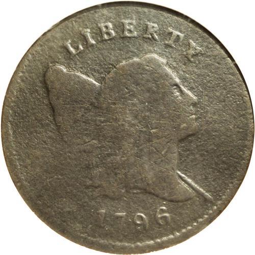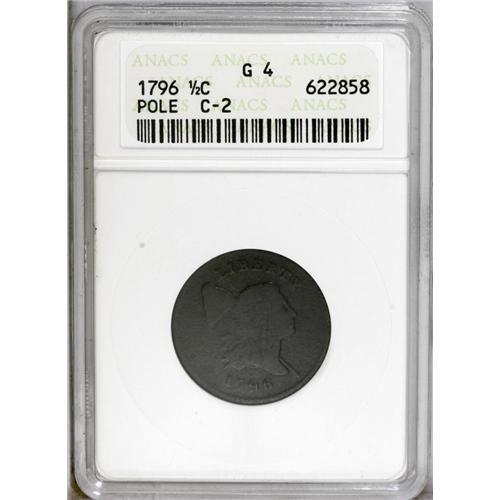<B>1796<1/2 C> With Pole Good 4 ANACS.</B></I> C-2, B-2a, High R.5. This coin is a survivor from an original mintage of only 1,390 pieces. The 1796 has long been regarded as the key issue in the U.S. half cent series, and examples of both the No Pole and With Pole varieties are difficult to locate in any grade. This coin has some problems--the surfaces are dark, and the texture is rough with scattered pitting. Still, most of the focal features are evident, and the date is well defined. An important opportunity for the early copper specialist. EAC 4.<BR><I>From The Steve Glenn Collection.</B></I> <BR><BR><B>Important notice:</B> Heritage usually auctions material at the rate of 200-250 lots per hour. On some occasions eBay Live bid software or the Internet may not be able to keep up with the pace of the auction. We recommend placing a realistic absentee bid now as insurance to avoid disappointment. Occasionally the auctioneer may eliminate or reject an eBay Live bid, and the auctioneer may also reopen a lot after the close of the eBay live bidding (usually because we missed an audience bid), and may reject your bid even if it shows you as the winning bidder. By bidding via eBay Live, you agree that Heritage may award the lot to another bidder at its sole discretion under the circumstances described above or any other reasonable circumstances. Since eBay bids are not shown to us until we open the lot on the floor, we treat those bids just like floor bids. In most cases the floor responds before the eBay bid is presented to us, due to Internet lag time, so for consistency we have made it a policy that floor bids are always considered first over tie eBay live bids. Also please note that all Heritage lots purchased through eBay Live carry a 20% Buyer's Premium. Please make sure you read the Terms and Conditions before you bid. This lot is being auctioned in conjunction with a live floor auction by Heritage Galleries & Auctioneers. All final auction and invoice information will be supplied by Heritage Galleries & Auctioneers, and all other information should be considered preliminary. Lot:204 <BR><BR><B>Winning Notification and Billing:</B> After the FINAL session in this auction is complete, Heritage will send e-mail and snail mail invoices. This process normally takes several days. All final auction and invoice information will be supplied by Heritage Galleries & Auctioneers, and all other information should be considered preliminary. <BR><BR>This auction will be conducted on a live auction floor and over the Internet through eBay Live. If you choose to place an absentee bid, please take a moment to <font color='#0000ff'><u><a href='http://pages.ebay.com/liveauctions/help/before/laabsentee.html'>learn how eBay Live absentee bidding works</a></u></font><font color='#000000'>