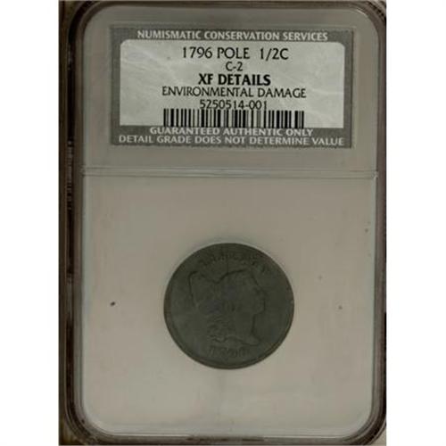 <B>1796 1/2 C With Pole--Environmental Damage--NCS. XF40 Details.</B></I> C-2, B-2, High R.4. Only 1,390 pieces were struck of the No Pole and With Pole subtypes combined, making them the rarest of the early U.S. half cents. The noted environmental damage is mostly fine-grained and microscopic, with all the major types clear save for LF and the N in CENT. The right wreath top is also a bit weak, and only about 30% of the dentilation is present. On the other hand, the smooth olive-brown surfaces show no singular abrasions. Overall a nice example, despite the NCS caveat, and one that should see spirited bidding. EAC 12. <BR><BR><B>Coin Engraver:</B> John Smith Gardner<BR><BR><b>Shipping:</b> Coins & Currency (<a target="_blank" href="http://www.heritageauctions.com/common/shipping.php">view shipping information</a>)