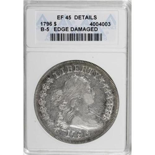 <B>1796 $1 Large Date, Small Letters--Edge Damaged--ANACS. XF45 Details.</B></I> B-5, BB-65, R.2. The rims of this partly lustrous Small Eagle dollar are problem-free, and the extent of any edge damage will be unknown until the piece is freed from its ANACS encapsulation. The lightly toned surfaces are minimally abraded. The diagnostic die lump from the I in AMERICA has yet to reach the nearby C. <I><BR>From The Diemer L. Fife Collection.</B></I><BR><BR><B>Coin Engraver:</B> Robert Scot<BR><BR><b>Shipping:</b> Coins & Currency (<a target="_blank" href="http://www.heritageauctions.com/common/shipping.php">view shipping information</a>)