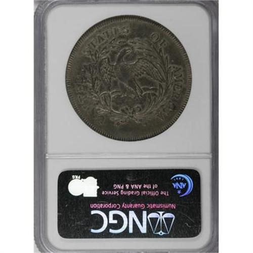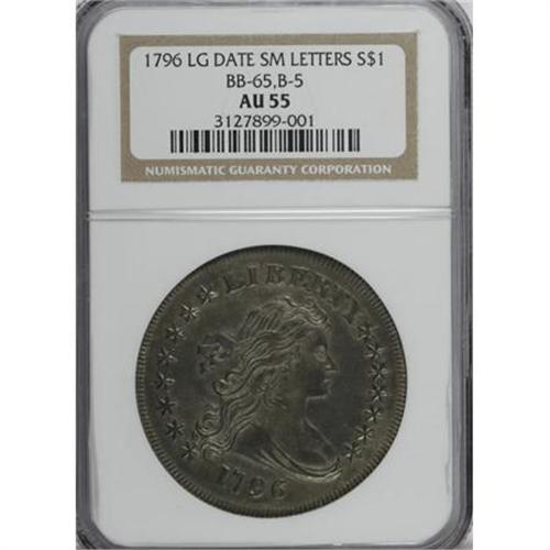 <B>1796 $1 Large Date, Small Letters AU55 NGC.</B></I> B-5, BB-65, R.2. Die State IV. A rare die state of a supposedly "common" dollar, although we have seen precious few of this die marriage in Heritage sales in recent years. The right-side stars are crowded close together, and on the reverse there is a leaf under the A in STATES, and leaves touch the bottoms of N, T, and D in UNITED. The most obvious diagnostic, however, is the massive cud die break through IC, which in this late state has covered the upright of I at one point and touches the C. This is a rarer die state than either of the two previous die states including State II, that usually seen. This intriguing coin boasts pretty, consistent golden-gray patina on both sides. A nice coin, one that will entice the early dollar specialists.<BR><BR><B>Coin Engraver:</B> Robert Scot<BR><BR><b>Shipping:</b> Coins & Currency (<a target="_blank" href="http://www.heritageauctions.com/common/shipping.php">view shipping information</a>)