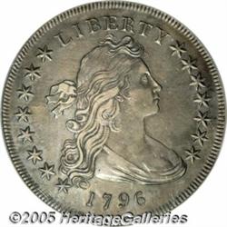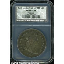 <B>1796<img border='0' src='http://www.heritagecoins.com/images/star.gif' width=10 height=10>$1 Small Date, Large Letters AU Details, Whizzed, NCS.</B></I> B-4, BB-61, R.1. A die lump above the 1 in the date affirms the variety. A whizzed example with deep gray color that is interspersed with golden hues. Good detail remains despite the obvious cleaning.<BR><I>From The Richard J. Chouinard Collection of United States Coins, Part Three.</B></I>