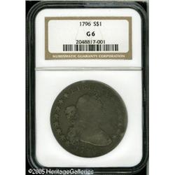 <B>1796<img border='0' src='http://www.heritagecoins.com/images/star.gif' width=10 height=10>$1 Small Date, Large Letters Good 6 NGC.</B></I> B-4, BB-61, R.2. Most easily attributed by the die dot over the 1 in the date and the location of a berry under the first T in STATES on the reverse. Pleasing light gray patina overlays each side, and the design elements are well centered on the planchet. What appears to be a mix of both adjustment marks, as well as some post-strike marks that initially resemble adjustment marks, are seen on the obverse. Lot:7311