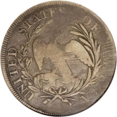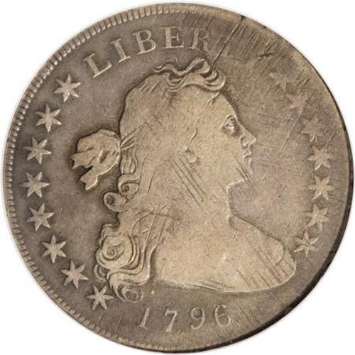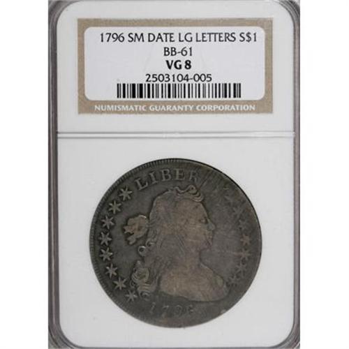 <B>1796 $1 Small Date, Large Letters VG8 NGC.</B></I> B-4, BB-61, R.3. This interesting piece exhibits adjustment marks on both sides, rather than the usual one side, obviously requiring considerable weight reduction. A soft strike affects the eagle's head and AMERICA, and a minor obverse rim nick is noted at 5 o'clock.<BR><BR><B>Coin Engraver:</B> Robert Scot<BR><BR><b>Shipping:</b> Coins & Currency (<a target="_blank" href="http://www.heritageauctions.com/common/shipping.php">view shipping information</a>)