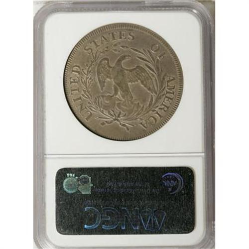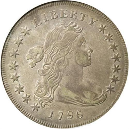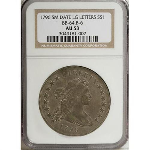 <B>1796 $1 Small Date, Large Letters AU53 NGC.</B></I> B-4, BB-61, R.3. Die State I. Very slight die lapping is evident on the obverse, in the form of weakened curls at the top of the head and in front of the forehead. The NGC holder is mislabeled "BB-64, B-6," which is really a shame because it would be finest of four known if the attribution was correct. As it is, this lovely early dollar is a remarkable example with gorgeous lilac-gray color. accented by splashes of olive on the highpoints. Dave Bowers estimates that as many as 2,000 examples could exist, although the actual total is believed by most specialists to be in the range of 300 to 400 coins. Only two or three dozen of those are as nice as this piece.<BR><BR><B>Coin Engraver:</B> Robert Scot<BR><BR><b>Shipping:</b> Coins & Currency (<a target="_blank" href="http://www.heritageauctions.com/common/shipping.php">view shipping information</a>)