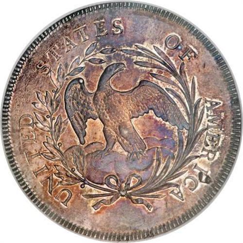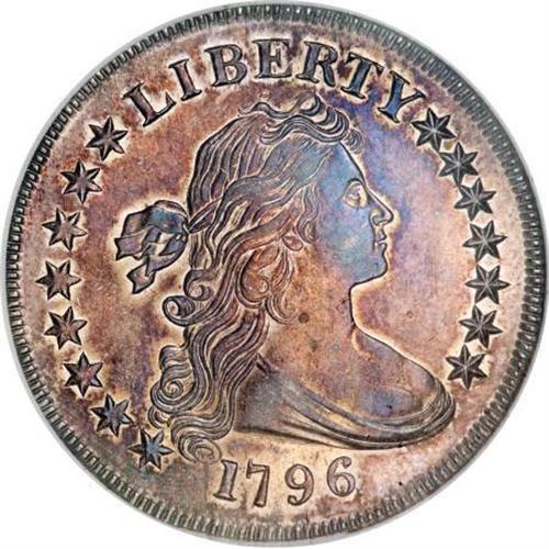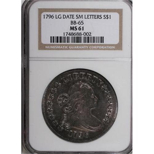 <B>1796 $1 Large Date, Small Letters MS61 NGC.</B></I> B-5, BB-65, R.2. Die State II. The diagnostic reverse die lump is attached to the right upright of I in AMERICA, but does not yet join the adjacent C. The obverse die was only used for B-5, and shows signs of lapping, especially among the upper hair curls that are incomplete. The lowest curl is also incomplete, with no central detail. No examples are known in an earlier die state with these features boldly defined, indicating that the die was lapped or polished prior to its first service at the Mint.<BR> The B-5 dollar is the second most plentiful 1796 variety, following the B-4 die pairing. Examples are generally available in all circulated grades, but seldom in Mint State grades like this piece. In fact, this is one of just three Mint State pieces recorded in the Notable Specimens section of Bowers' <I>Encyclopedia.</B></I> One of the three is now part of the Eric Newman Educational Foundation museum, and unavailable to the current generation of collectors. An MS62 example appeared in the Cardinal Collection, the Newman coin is considered MS61, and this piece from the Alto Collection is certified MS61. It is either second or third finest known.<BR> This deep lilac toned specimen has splashes of gold and blue on each side. The strike is exceptional with every hair detail on the obverse and every feather detail on the reverse boldly delineated. In fact, even the eagle's eye is boldly evident.<BR><I>Ex: Stack's (12/1970), lot 1063</B></I>; <I>Stack's (9/1972), lot 978; Stack's (4/1975), lot 154.</B></I><BR><I>From The Queller Family Collection of Silver Dollars.</B></I><BR><BR><b>Shipping:</b> Coins & Currency (<a target="_blank" href="http://www.heritageauctions.com/common/shipping.php">view shipping information</a>)