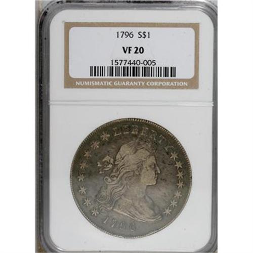 <B>1796 $1 Small Date, Small Letters VF20 NGC.</B></I> B-2, BB-63, R.4. The fields are cream-gray, and contrast slightly with the lighter slate toning on the device highpoints. This pleasing VF early dollar lacks noticeable marks, and even the rims have only a few minor abrasions. The Small Eagle type is scarcer than its Heraldic Eagle successor, and B-2 is considered scarcer than two other 1796 varieties, B-4 and B-5.<BR><BR><B>Coin Engraver:</B> Robert Scot<BR><BR><b>Shipping:</b> Coins & Currency (<a target="_blank" href="http://www.heritageauctions.com/common/shipping.php">view shipping information</a>)