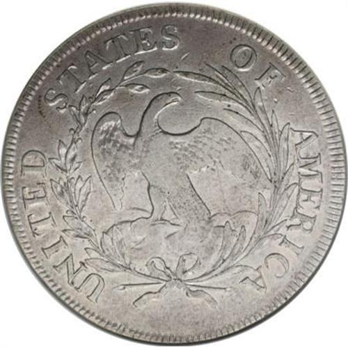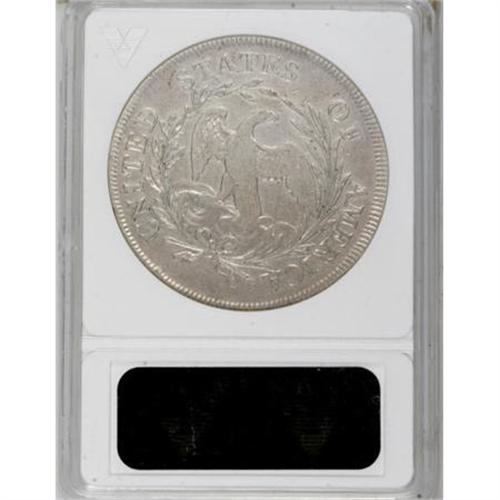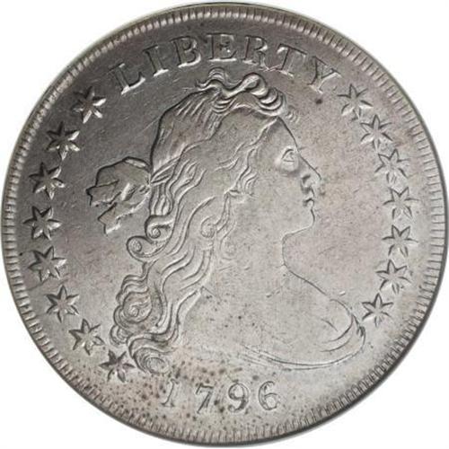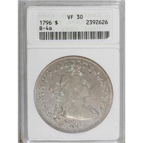 <B>1796 $1 Small Date, Large Letters VF30 ANACS.</B></I> B-4, BB-61, R.3. The obverse, and the variety, is usually identified by a tiny die chip that is centered over the 1 in the date, and visible on nearly all known examples, including this piece, although some dark toning spots in the same vicinity camouflage the die chip. Light pearl-gray surfaces retain traces of luster on the reverse.<BR><BR><B>Coin Engraver:</B> Robert Scot<BR><BR><b>Shipping:</b> Coins & Currency (<a target="_blank" href="http://www.heritageauctions.com/common/shipping.php">view shipping information</a>)
