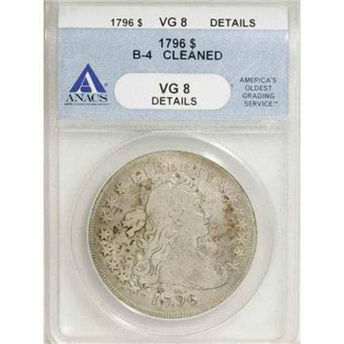 <B>1796 $1 Small Date, Large Letters--Cleaned--ANACS. VG8 Details.</B></I> B-4, BB-61, R.3. This Small Eagle Draped Bust dollar has cloudy gray surfaces and freckles of golden-brown patina. The reverse border displays deeper russet toning. All stars and legends are crisp, and some hair and plumage detail remains.<BR><I>From The John Stimson, Sr. Collection, Part Two.</B></I><BR><BR><B>Coin Engraver:</B> Robert Scot<BR><BR><b>Shipping:</b> Coins & Currency (<a target="_blank" href="http://www.heritageauctions.com/common/shipping.php">view shipping information</a>)