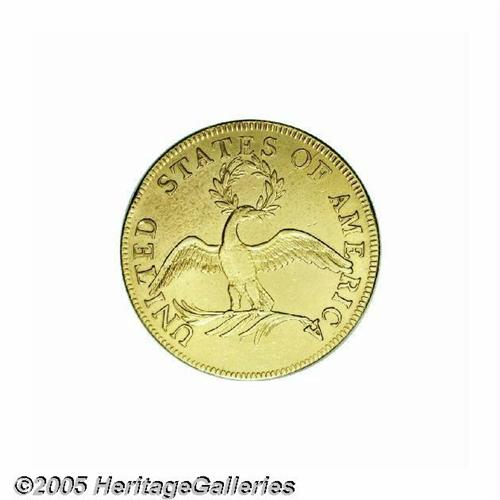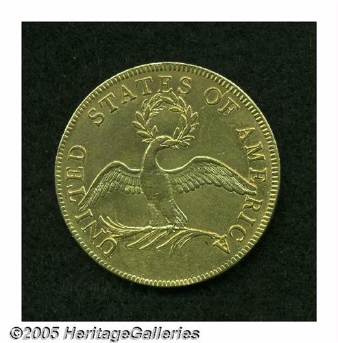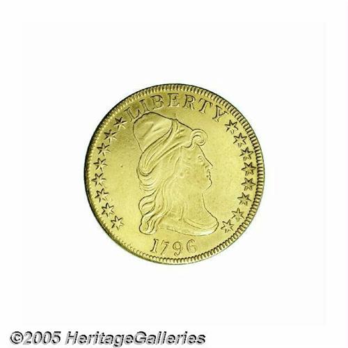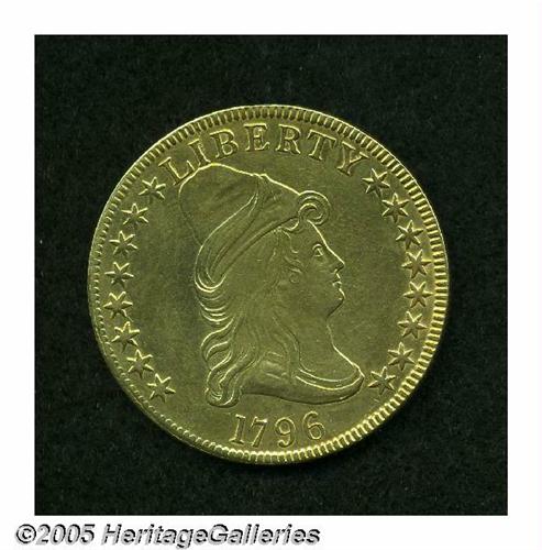 <B>1796<$10> AU55 Cleaned, Reverse Field Smoothed Uncertified.</B></I> Breen-6832, B. 1-A, Taraszka-6, R.4. Only 4,146 pieces were struck of the 1796 ten, after the five deliveries of 1795-dated coins were netted out of the year's mintage. Apparently, the novelty of the new ten dollar coin had subsided significantly by 1796, enough to ensure that most examples of the 1796 entered circulation and stayed there. This date is much scarcer than the 1795 and was not saved in any appreciable numbers as the 1795 tens were. In fact, only 35-50 coins are believed extant today in all grades. This coin certainly has its share of problems, including obvious cleaning and less-obvious smoothing of the upper left reverse field. However, the design elements show very little evidence of actual handling in the channels of commerce. Liberty's hair curls and the center of the eagle's breast are weakly defined, but there are no obvious or mentionable abrasions on either side. A light speckling of reddish patina, possibly an iodine stain, is seen to the left of the wreath on the reverse.