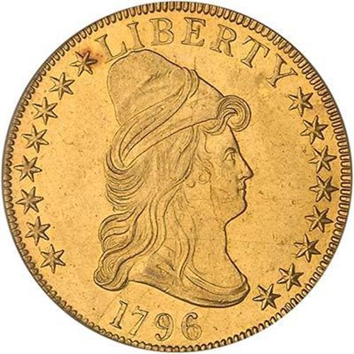 Just one die variety is known for the 1796 capped bust eagle. The obverse stars total 16, reflecting Tennessee's admittance as a new state, arranged eight and eight. LIBERTY is positioned higher on the obverse than on the 1795 varieties, starting from the peak of Liberty's cap (farther left than on the 1795 coin) and ending adjacent her forelocks. The palm branch on the reverse now bears 11 leaves instead of 13 or nine as in 1795. The mintage is 4,146. Even yellow gold with tinges of greenish color throughout. Somewhat reflective in the fields, as seen on the few remaining examples, it retains much of its original bloom off the dies. As you can see from the detailed photos, this coin was sharply struck by the dies. In fact, when was the last time you saw a 1796 eagle that showed the feathers on the eagle's neck and body? Rarely perhaps, which makes this coin special indeed.