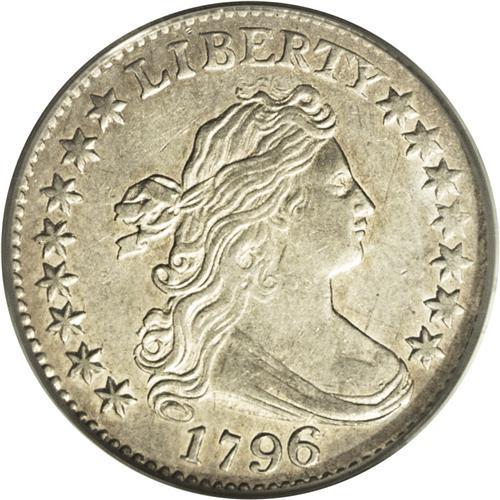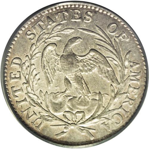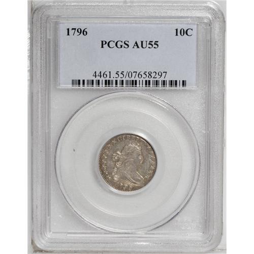 <B>1796<10C> AU55 PCGS.</B></I> JR-3, R.5. A leaf touches the base of the U in UNITED, which is diagnostic. Medium gray and faint golden peripheral toning is original and attractive. Liberty's shoulder and the eagle's breast have only light rub, and the surfaces are nearly abrasion-free. A retained die break above the first T in STATES produces several "branches", one of them extending through the eagle's wing. The majority of 1796 dimes are either JR-1 or the comparatively abundant JR-2, making this a rare opportunity to obtain a Choice AU example of a much tougher variety.