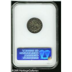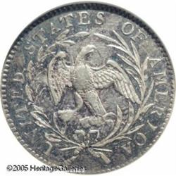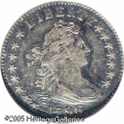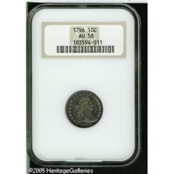 <B>1796 10C AU58 NGC.</B></I> JR-6, R.3. Many diagnostics have been noted for the identification of this variety, although in practice a quick glance at the date will confirm the attribution. This is sometimes called the "hyphenated date" as all examples have a die crack through the digits 179 of the date. On later die states, this die crack becomes quite heavy. In <I>Early United States Dimes,</B></I> the reverse is described as lacking an outer berry between the letters D and S in UNITED STATES. Examination of this coin reveals a tiny berry, about half the size of the others, in this location. Though typically weak at the centers, this is an attractive example with nearly full luster and delicate heather toning, accented by steel-blue patina. Both sides are lightly scratched as often is the case with these 200 year old silver coins. Lot:6173