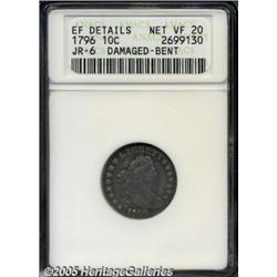 <B>1796 10C --Damaged, Bent--ANACS. XF Details, Net VF20.</B></I> JR-6, R.3. A later die state with the obverse cracks quite heavy. Moderate gray-blue toning is seen in the fields and in the recesses of the devices with bright accents over the highpoints. The nature of the damage is primarily a dig at the point of Liberty's chin and three lines in the left obverse field that seem to point to a small planchet flake.