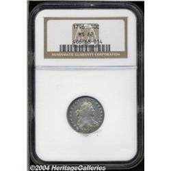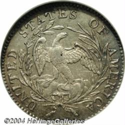 <B>1796<10C> MS62 NGC.</B></I> JR-1, R.3. The variety is attributed by the die cud break at star 1, and the two leaf points under the left foot of the A in STATES. The silver-gray surfaces have just a touch of faint olive and violet color around the obverse borders, while similar colored toning that is a shade darker visits the right border of the reverse. Sharp detail is seen on most of the design elements, save for weakness on the eagle's breast and legs. The border dentilation is clear on both sides, and the design features are nicely centered on the planchet. Short adjustment marks (as made) are located in the lower portions of Liberty's hair. The surfaces are generally devoid of significant abrasions, but do display a somewhat subdued luster and restricted areas of light porosity and die rust. Population: 19 in 62, 51 finer (7/04). <BR><BR><B>Important notice:</B> Heritage usually auctions material at the rate of 200-250 lots per hour. On some occasions eBay Live bid software or the Internet may not be able to keep up with the pace of the auction. We recommend placing a realistic absentee bid now as insurance to avoid disappointment. Occasionally the auctioneer may eliminate or reject an eBay Live bid, and the auctioneer may also reopen a lot after the close of the eBay live bidding (usually because we missed an audience bid), and may reject your bid even if it shows you as the winning bidder. By bidding via eBay Live, you agree that Heritage may award the lot to another bidder at its sole discretion under the circumstances described above or any other reasonable circumstances. Since eBay bids are not shown to us until we open the lot on the floor, we treat those bids just like floor bids. In most cases the floor responds before the eBay bid is presented to us, due to Internet lag time, so for consistency we have made it a policy that floor bids are always considered first over tie eBay live bids. Also please note that all Heritage lots purchased through eBay Live carry a 20% Buyer's Premium. Please make sure you read the Terms and Conditions before you bid. </span></font></tr></table></td></tr></table>