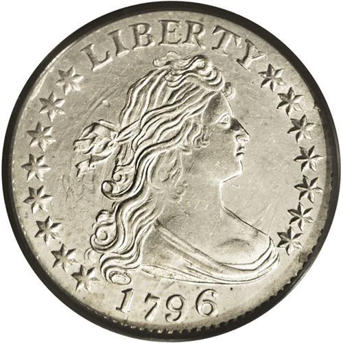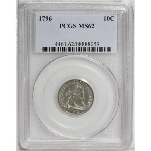 <B>1796<10C> MS62 PCGS.</B></I> JR-2, R.4. A scarcer variety, JR-2 can be identified by the placement of star 15 right against the bust and a berry below the left edge of the first S in STATES. The die pairing represents 10 percent or less of the extant population of 1796 dimes. This bright, untoned silver-gray example has excellent sharpness on the obverse and flatness on the eagle's breast is more or less standard for the variety. Both sides exhibit notable die clashing, a common occurrence on early dimes. Desirable Uncirculated quality for this first year design. Population: 14 in 62, 26 finer (7/06).