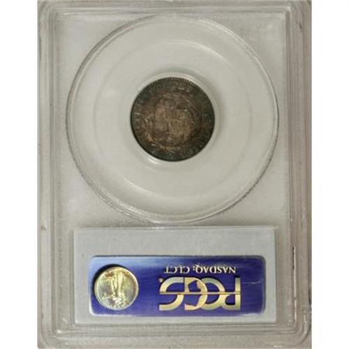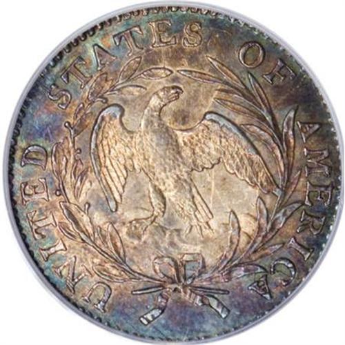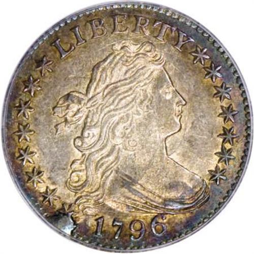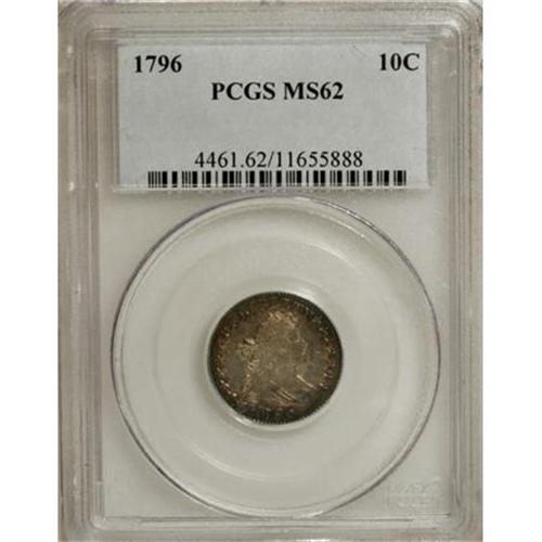 <B>1796 10C MS62 PCGS.</B></I> JR-1, R.3. This is the most common of six varieties recorded for the 1796 dimes. Although at least one perfect obverse specimen is known today, in practice this variety is instantly recognized by the prominent rim cud at star 1.<BR> A lovely Mint State piece, this example has full luster with light silver color at the center on each side. The obverse gradually changes to champagne, gold, and blue at the borders while the reverse has champagne, changing to steel and lilac peripheral toning.<BR> A later die state, the rim cud encroaches upon three star points and covers approximately four dentils. There is a crack across the bust and prominent clash marks in the fields. The reverse die has numerous cracks itemized in the <I>Early Dime </B></I>book by David Davis, et al.<BR><BR><B>Coin Engraver:</B> Robert Scot<BR><BR><b>Shipping:</b> Coins & Currency (<a target="_blank" href="http://www.heritageauctions.com/common/shipping.php">view shipping information</a>\)