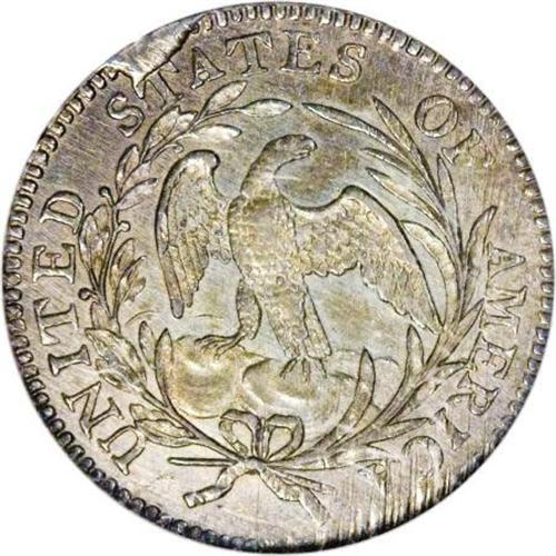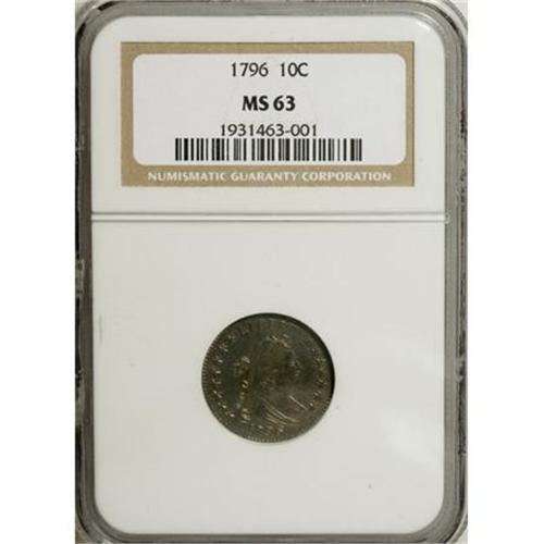 <B>1796 10C MS63 NGC.</B></I> JR-3, R-5. This amazing dime is the finest of just two known examples of the terminal die state with a triangular rim break over the first T in STATES, which has advanced to a full cud. The other example is just XF40 and appeared in Bowers and Merena's sale of June 1990, lot 481. And for the really wonderful numismatic treat, the reverse has very light peripheral adjustment marks that can even be seen on the top surface of the rim break. All of the design details on both sides are more than adequately defined, with nearly full plumage on the eagle, flat only on a few of the breast feathers. The fields on both sides are reflective beneath deep steel and iridescent toning. Slight weakness on the obverse border left of the date is clearly the result of the reverse rim break.<BR> In addition to its status as the finest known late state example, it rivals an NGC MS63 example that we sold in our July 2005 auction for the finest JR-3 dime. This variety is the second rarest of the year, representing only about 5% of all known 1796 dimes. High grade examples are especially elusive, and this example may be the finest known of the variety. This coin and the 2005 specimen are essentially tied for top honors in the Condition Census. We are not aware of any finer specimens.<BR> This is a well known specimen that is pedigreed to the Dr. George P. French, T. James Clarke, and Lester Merkin collections. More recently, it appeared in the amazing John Walter Whitney collection of 1796 coinage. At the time of its appearance in the New Netherlands (47th) Sale of the T. James Clarke collection, it was described by Ford and Breen as unique in the terminal die state. Only one other has been seen in more than 50 years since that sale. Clarke's collector box along with several other pedigree slips accompany this lot.<BR><I>Ex: Dr. George P. French; T. James Clarke (New Netherlands Coin Co., 4/1956), lot 1621; Lester Merkin (Stack's, 11/1994), lot 767; John Whitney (Stack's, 5/1999), lot 1767.</B></I><BR><BR><B>Coin Engraver:</B> Robert Scot<BR><BR><b>Shipping:</b> Coins & Currency (<a target="_blank" href="http://www.heritageauctions.com/common/shipping.php">view shipping information</a>\)