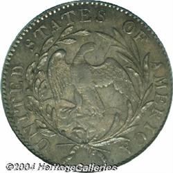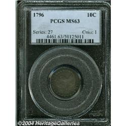 <B>1796<10C> MS63 PCGS.</B></I> JR-2, R-4. Rich golden-brown and gunmetal-blue patina embraces this well preserved and imposing example. A scarce variety, JR-2 is identified by a berry below the left edge of the first S in STATES. On this marriage, the borders are well struck, while the centers and the eagle's head are typically defined. Clash marks (as made) are prominent on each side, although the dies are otherwise perfect. A minor handling mark in the field below the eagle's beak will identify this piece to future collectors. Surely within the Condition Census for JR-2; the John Reich Collectors Society standard reference states "Finest seen is MS-63 in dealer's stock." <BR><BR><B>Important notice:</B> Heritage usually auctions material at the rate of 200-250 lots per hour. On some occasions eBay Live bid software or the Internet may not be able to keep up with the pace of the auction. We recommend placing a realistic absentee bid now as insurance to avoid disappointment. Occasionally the auctioneer may eliminate or reject an eBay Live bid, and the auctioneer may also reopen a lot after the close of the eBay live bidding (usually because we missed an audience bid), and may reject your bid even if it shows you as the winning bidder. By bidding via eBay Live, you agree that Heritage may award the lot to another bidder at its sole discretion under the circumstances described above or any other reasonable circumstances. Since eBay bids are not shown to us until we open the lot on the floor, we treat those bids just like floor bids. In most cases the floor responds before the eBay bid is presented to us, due to Internet lag time, so for consistency we have made it a policy that floor bids are always considered first over tie eBay live bids. Also please note that all Heritage lots purchased through eBay Live carry a 20% Buyer's Premium. Please make sure you read the Terms and Conditions before you bid.