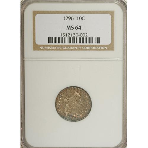 <B>1796 10C MS64 NGC.</B></I> JR-4, R.4. Star 1, the lowest star on the left, is distant from the hair curls, and this position is diagnostic for the obverse die. The upper curve of the digit 6 is lightly recut below. This obverse was shared with two different reverse dies for varieties JR-3 and JR-4. The position of the berry below TE of UNITED distinguishes these reverse dies, with the berry below the upright of E on this reverse. Six different die varieties exist for the 1796 dimes across a mintage of 22,135 coins that were struck during the year. Approximately 10,000 more dimes were coined in February and March 1797, and it is thought that those coins were also dated 1796. The JR-4 variety is scarce and generally considered to be the third rarest of the year. About half a dozen Mint State examples are known, including this Choice example.<BR> The authors of the JR dime reference, <I>Early United States Dimes, 1796-1837,</B></I> explained the existence of a relatively large Mint State population for this date: "Special pride in workmanship was taken in manufacturing the 1796 dimes; most early pieces are well struck and are quite prooflike in high grade. This was partly because the 1796 dimes, as the first issue of a new coin denomination, were frequently used as presentation pieces for visiting dignitaries. Because of their high quality, such personages and their descendants frequently preserved these dimes for two or more generations before ultimately disposing of them."<BR> The "presentation purposes" argument was a favorite of Walter Breen who repeated this argument for high grade examples of many early coinage issues. Breen also liked another argument that many high grade coins were "saved as first of their kind." To our knowledge, neither of these arguments are historically documented, although the second is reasonable conjecture. While there are certainly occasional references to coins being presented to dignitaries, either as individual pieces or parts of sets, there is no documentary evidence that this was a routine process. Besides, it technically would have been illegal, as all coinage had to be paid directly back to depositors of metal in the order that deposits were received.<BR> This piece, a lovely near-Gem example, is sharply struck with fully prooflike fields on both sides. Slight weakness is evident only at the centers on each side. The surfaces have lovely ivory color with champagne overtones and hints of light blue on each side. Although each side has a few fine abrasions, there are no individual pedigree markers.<BR><BR><b>Shipping:</b> Coins & Currency (<a target="_blank" href="http://www.heritageauctions.com/common/shipping.php">view shipping information</a>)