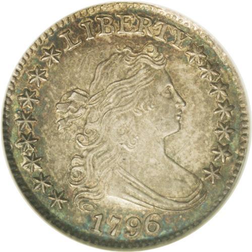 <B>1796<10C> MS64 NGC.</B></I> JR-4, R.4. TY touch on this variety, and star 1 is far from the hair curls. On the reverse there are two berries under the upright of the first E, and the leaf tip is under the right side of the first A.<BR> The first U.S. issue of dimes (or "dismes") occurred in this year, with a reported mintage of 22,135 pieces delivered between January 18 and May 27, from five obverse and four reverse dies in six combinations. The consistently high quality of this premier issue has repeatedly been remarked upon, and history indicates that 1796 dimes were frequently given as presentation pieces to visiting dignitaries at the Philadelphia Mint.<BR> This conditionally scarce near-Gem shows lovely electric-blue toning near the peripheries, and rich purple-brown coloration in the central regions. The strike is very even and quite crisp. Liberty's hair detail is meticulously sculpted, with each strand outlined and clear. The vertical line that marks the iris of Liberty's eye is plain, and there is bold contradistinction between the hair and the forehead. On the reverse, the eagle's breast and wings show pleasing feather detail. The two sides display noticeable die clash marks in the field areas, but are essentially free of mentionable distractions from any occurrence after the date of production.<BR> The discerning specialist will recognize this coin, with a winning combination of high technical merit and superior visual appeal, as a rare find and a significant bidding opportunity.