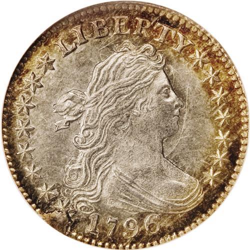 <B>1796 10C MS66 NGC.</B></I> JR-1, R.3. This stunning Gem is a remarkable example of the most common 1796 dime variety, instantly recognized by the prominent rim break or cud at star 1 on the obverse. We are only aware of a single example of this variety that does not have such a rim break.<BR> This example is one of the latest die states we have seen. The obverse has prominent clash marks in the field, all around the bust including the entire ribbon bow and stems above Liberty's head. A long thin line in front of Liberty's face was described in the JR dime book as a arc-like crack, but we believe this is actually a clash mark from the edge of the eagle's wing. There is a die crack visible across Liberty's throat to the shoulder. Considerable die lapping is evident on the obverse, with Liberty's forecurl completely detached, and the second lowest curl behind the shoulder consists merely of two curved lines isolated in the field. The reverse has several die cracks in addition to sharp clash marks.<BR> This piece is one of several Mint State examples of this variety that are known, and it is probably the single finest of all such coins. The surfaces are highly lustrous with frosty silver color. Both sides are mostly ivory with gorgeous peripheral russet toning. It is sharply struck throughout, with the exception of slight weakness at the center on each side, typical of nearly all known pieces. The fields are not prooflike, as sometimes seen, but rather are satiny in appearance. Census: 8 in 66, 2 finer (10/06). The NGC Census encompasses all varieties of 1796 dimes, not just the JR-1 variety.<BR><I>From The Essex Palm Collection.</B></I><BR><BR><b>Shipping:</b> Coin/Currency (<a target="_blank" href="http://www.heritageauctions.com/common/shipping.php">view shipping information</a>)