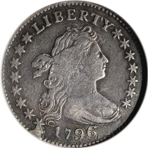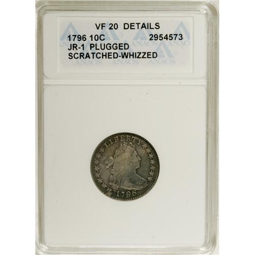 <B>1796 10C --Plugged, Scratched, Whizzed--ANACS. VF20 Details.</B></I> JR-1, R.3. Plugged near the bust tip, and opposite on the field between OF and AMERICA. A few pinscratches cross the lower half of the wreath, and a couple of short thin marks are noted beneath the B in LIBERTY. Granular and somewhat bright from whizzing, although retoned russet-brown and forest-green. Nonetheless, a richly detailed piece. The cud beneath the first star promptly identifies the JR-1 variety.<BR><I>From The Hoosier Discovery Collection.</B></I><BR><BR><b>Shipping:</b> Coins & Currency (<a target="_blank" href="http://www.heritageauctions.com/common/shipping.php">view shipping information</a>)