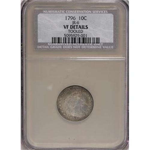<B>1796 10C --Tooled--NCS. VF Details.</B></I> JR-6, R.3. A suspiciously luminous example, lightly pockmarked with pale silver-gray surfaces that show elements of rust and turquoise at the margins. The fields on each side show smoothing, and the lower part of the eagle has crude re-engraving. Still, a desirable example of the first Draped Bust dime issue.<BR><BR><B>Coin Engraver:</B> Robert Scot<BR><BR><b>Shipping:</b> Coins & Currency (<a target="_blank" href="http://www.heritageauctions.com/common/shipping.php">view shipping information</a>)