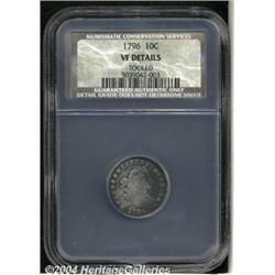 <B>1796<10C> VF Details, Tooled, NCS.</B></I> JR-1, R.3. Leaf tip below F in OF nearly touches the O in OF, and a heavy obverse die break (cud) is seen at 7 o'clock. Some smoothing is seen on Liberty's head, probably an effort to remove some surface marks. Deep charcoal-gray color surrounds the border areas while the centers are a lighter silver-gray. Still, a worthwhile, well detailed example for the budget-minded type collector.<BR><I>From The Paulsboro Collection, Part Three.</B></I> <BR><BR><B>Important notice:</B> Heritage usually auctions material at the rate of 200-250 lots per hour. On some occasions eBay Live bid software or the Internet may not be able to keep up with the pace of the auction. We recommend placing a realistic absentee bid now as insurance to avoid disappointment. Occasionally the auctioneer may eliminate or reject an eBay Live bid, and the auctioneer may also reopen a lot after the close of the eBay live bidding (usually because we missed an audience bid), and may reject your bid even if it shows you as the winning bidder. By bidding via eBay Live, you agree that Heritage may award the lot to another bidder at its sole discretion under the circumstances described above or any other reasonable circumstances. Since eBay bids are not shown to us until we open the lot on the floor, we treat those bids just like floor bids. In most cases the floor responds before the eBay bid is presented to us, due to Internet lag time, so for consistency we have made it a policy that floor bids are always considered first over tie eBay live bids. Also please note that all Heritage lots purchased through eBay Live carry a 20% Buyer's Premium. Please make sure you read the Terms and Conditions before you bid. </span></font></tr></table></td></tr></table>