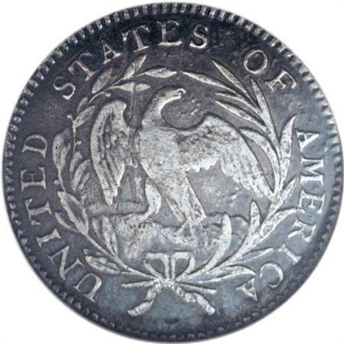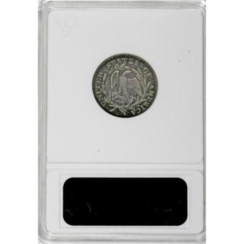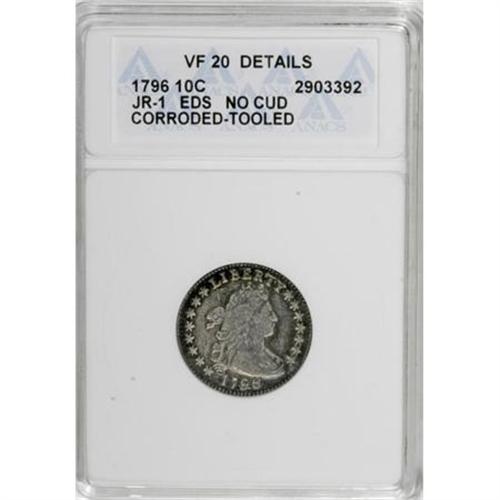 <B>1796 10C --Corroded, Tooled--ANACS. VF20 Details.</B></I> JR-1, R.3. An early die state (as indicated on the insert) without the cud at star 1 ("No Cud" is also indicated on the holder). The still-standard reference to the series, <I>Early United States Dimes 1796-1837,</B></I> states "all specimens seen have die cud at S1 on obverse which increases in size until S1 obliterated." This piece is an exception, and was presumably among the first few dimes strike. In its A.N.R. appearance, that cataloger noted only one other JR-1 was known without the star 1 cud, the high-grade Jimmy Hayes-Whitney example sold in 1999.<BR>Silver-gray surfaces display whispers of purple color, especially on the reverse, and some micro porosity, again mostly on the reverse. A few minute contact and tooling marks are noted on both sides.<BR><I>Ex: Coin Galleries, 11/97, lot 2815; C.L. Lee Sale (American Numismatic Rarities, 9/05), lot 232.</B></I><BR><BR><B>Coin Engraver:</B> Robert Scot<BR><BR><b>Shipping:</b> Coins & Currency (<a target="_blank" href="http://www.heritageauctions.com/common/shipping.php">view shipping information</a>)