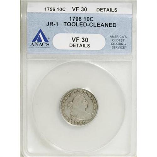 <B>1796 10C --Tooled, Cleaned--ANACS. VF30 Details.</B></I> JR-1, R.3. The cud from the rim to the first star identifies this first-year Draped Bust marriage. The pearl-gray obverse color suggests a mild cleaning, and marks are noted near the rim at 10 o'clock on the obverse and 11 o'clock on the reverse.<BR><I>From The John Stimson, Sr. Collection, Part Two.</B></I><BR><BR><B>Coin Engraver:</B> Robert Scot<BR><BR><b>Shipping:</b> Coins & Currency (<a target="_blank" href="http://www.heritageauctions.com/common/shipping.php">view shipping information</a>)