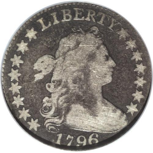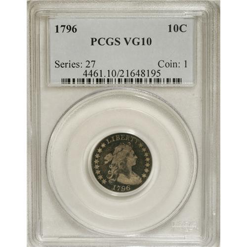 <B>1796 10C VG10 PCGS.</B></I> JR-4, R.4. The TY in LIBERTY touch at the peak of the letters, and the first star is distant from the bust. A pair of berries below the upright of the E in UNITED further confirms this scarce die marriage. A deep gray piece that has blushes of lighter silver-gray color on the highpoints of the devices. A few minor scratches are seen on each side, entirely typical for the assigned grade.<BR><BR><b>Shipping:</b> Coins & Currency (<a target="_blank" href="http://www.heritageauctions.com/common/shipping.php">view shipping information</a>)