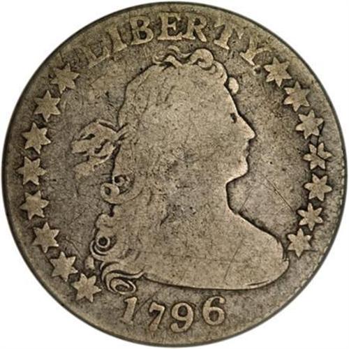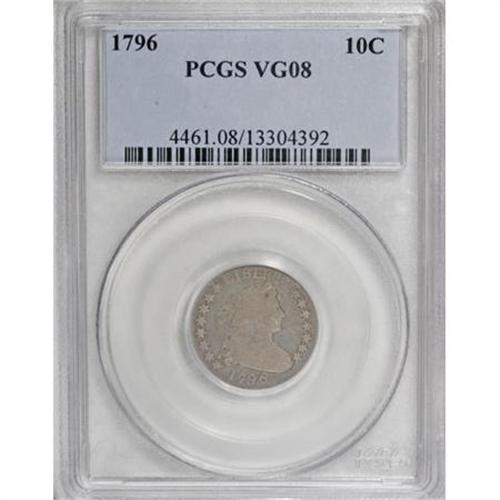 <B>1796 10C VG8 PCGS.</B></I> JR-2, R.4. On the obverse, LIBE and RTY are evenly spaced; ER touch. R high. On the reverse, the left branch has five berries; the middle inner berry appears doubled. A pleasing degree of design detail remains evident, for the grade. The light-gray surfaces seem original, and show the usual faint pinscratches across both sides. An appealing example of this highly popular early dime issue. <BR><BR><B>Coin Engraver:</B> Robert Scot<BR><BR><b>Shipping:</b> Coins & Currency (<a target="_blank" href="http://www.heritageauctions.com/common/shipping.php">view shipping information</a>)