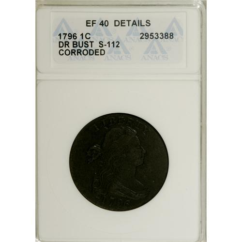 <B>1796 1C Draped Bust, Reverse of 1794--Corroded--ANACS. XF40 Details.</B></I> S-112, B-19, High R.4. A splendidly detailed example of this elusive die pairing. Moderately pitted, but the medium brown toning is consistent, and there are no relevant marks. EAC 12.<BR><BR><b>Shipping:</b> Coins & Currency (<a target="_blank" href="http://www.heritageauctions.com/common/shipping.php">view shipping information</a>)