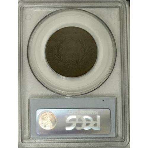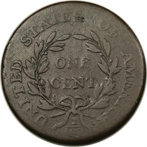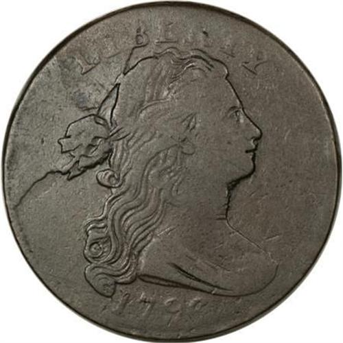 <B>1796 1C Draped Bust, Reverse of 1795. Fine 12 PCGS. S-99, B-22, R.5. </B></I> <B>Noyes VG10; tied for CC-6. Photo #26846. Our EAC Grade VG10.<BR><BR>Equivalents.</B></I> Gilbert 38; Clapp-Newcomb 30; EAC 22; <I>Encyclopedia</B></I> 1688; PCGS #1401.<BR><B><BR>Variety. </B></I>B leans right and ERT are widely spaced. Reverse of 1795. Inside triplets left of ONE and CENT. The obverse appears on S-98 and S-99. The reverse appears on S-99 and NC-4.<BR><B><BR>Surfaces. </B></I>Smooth and attractive medium brown surfaces. The obverse has a tiny rim bump at 3 o'clock, and the reverse has a small dent at the lower right curve of the final S. The usual circulation marks are evident in the fields, and microscopic hairlines cross Liberty's face. Aside from these few blemishes the surfaces are exceptionally smooth, and highly unusual in such a state.<BR><BR><B>Die State III.</B></I> This is a splendid late-state example with delightful die cracks in the left obverse, through the field, hair ribbon, and B of LIBERTY. The area above and left of the crack is raised, a massive retained cud.<BR><BR><B>Appearances. </B></I>The obverse and reverse are illustrated in Noyes (2007).<BR><BR><B>Census.</B></I> Finest known grades just VF35 per Bland, or VF30 per Noyes. Among the top six in Noyes' Census is an example in the ANS Collection, along with another ANS coin that is tied with this piece for sixth and seventh best. <BR><BR><B>Commentary.</B></I> In <I>Early American Cents</B></I>, Sheldon rated the S-99 Rarity-6, although he commented that he knew of just nine or 10 examples. In 1957, he raised the rating to Rarity-7, with quite a number of new specimens found since that time. The variety crossed over to the Rarity-6 level in the early 1960s. In the 1973 "Early Cent Revision," it was called Low Rarity-6, and probably reached Rarity-5 in the 1990s.<BR><BR><B>Provenance.</B></I> <I>James F. Ruddy (10/1969); Jules Reiver (Heritage, 1/2006), lot 19279.</B></I><BR><BR><B>Personality.</B></I> <B>John Cope</B></I> served as an adjuster at the Mint, according to the payroll record of October 10, 1795. On August 31, 1799, he signed a bond of indemnity promising to return to work after the yellow fever risk was over.<BR><BR><b>Shipping:</b> Coins & Currency (<a target="_blank" href="http://www.heritageauctions.com/common/shipping.php">view shipping information</a>)