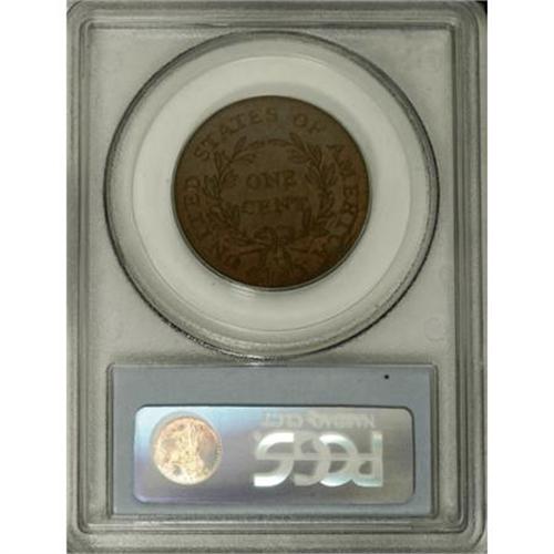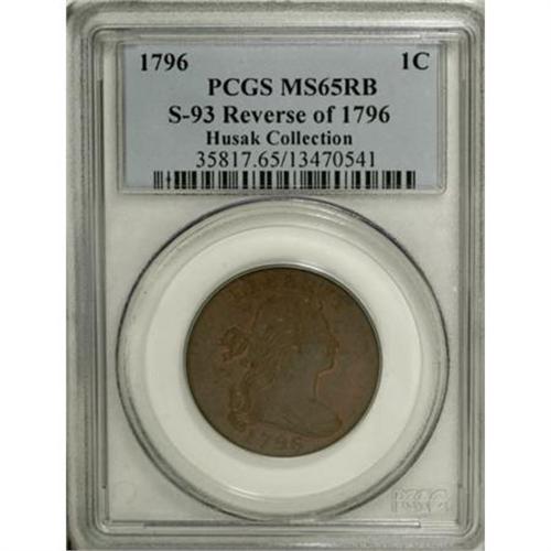 <B>1796 1C Draped Bust, Reverse of 1795. MS65 Red and Brown PCGS. S-93, B-34, R.3.</B></I> <B>Bland MS65; CC-1. Noyes MS65; CC-1. Photo #20187. Our EAC Grade MS63.<BR><BR>Equivalents.</B></I> Proskey 11; Doughty 81; Gilbert 2; McGirk 7A; Ross 2B; Clapp-Newcomb 2; EAC 34; <I>Encyclopedia</B></I> 1690; PCGS #1402.<BR><B><BR>Variety. </B></I>Hyphen die chip between 7 and 9. Reverse of 1795. Stem nearly touches bottom of U. The obverse appears on S-93, S-94, S-95, S-96, NC-2, and NC-3. The reverse appears on S-93.<BR><B><BR>Surfaces. </B></I>Both sides are splendid light brown with ample original mint red that is slightly brighter near the obverse devices. The usual planchet marks remain on both sides, in the fields and on the devices, but they are especially evident on the obverse. Slight doubling is evident beneath the chin. The obverse has a thin dark toning line diagonally up to the right in the right obverse field, and a small dark steel spot on the bust near the junction with the throat.<BR><B><BR>Die State VII. </B></I>A late die state, although Breen's descriptions in his <I>Large Cent Encyclopedia</B></I> fail to correspond exactly with this coin. The obverse has light clash marks that are beginning to fade. The reverse has numerous cracks through and about ERICA, the right ribbon end and stem, and the fraction, along with clash marks in that area. It appears that the die has splintered in the area of the fraction and right ribbon end, with several tiny die cracks intermingled among the clash marks.<BR><BR><B>Appearances. </B></I>The obverse and reverse are illustrated in Noyes (1991 and 2007).<BR><BR><B>Census.</B></I> In a word, this piece is incredible, the finest known 1796 S-93 cent, and one of the finest 1796 Draped Bust cents, regardless of variety. Even the majority of the S-119 cents from the Nichols Find are no finer, although the Nichols Find coins are on planchets with an entirely different texture or fabric.<BR><BR>This specimen is the only MS65 1796 Draped Bust cent in Bland's Census, regardless of variety. Noyes records similar examples of S-103 and S-110.<BR><BR><B>Commentary.</B></I> The evidence presented by this specimen indicates it was struck on a "concavo-convex" blank, more simply described as a cupped or dished flan, usually known as a "Coltman" blank. Breen notes: "Coltman blanks are readily identifiable: the coins made from them have the border on one side rounded with missing dentils, clear dentils on the other side, and they normally come dark."<BR><BR><B>Historical Note.</B></I> An early supplier of copper was Mr. Thomas Clifford, a Philadelphia merchant, who sold nearly a ton of the metal to the Mint in February 1796. He recommended the firm of his father-in-law, William Coltman, who represented The Governor & Company of Copper Miners, able to furnish ready-made planchets. The firm operated in Wales, just east of Swansea. Coltman's firm sent over 11 tons of copper, in sheets and blanks, arriving on October 16, 1796. The blanks were described as cupped, as rough as cast iron, and discolored, necessitating an extra step of cleaning each blank before it was usable. Elias Boudinot sent a complaint to the firm a few days later and refused to buy any more of its product.<BR><BR><B>Provenance.</B></I> <I>Francis H. Lee (circa 1913); Essex Institute (Stack's, 2/1975), lot 137, $6,500; R.E. Naftzger, Jr. (2/1992); Eric Streiner (5/1992); John Whitney (Stack's, 5/1999), lot 1725, $36,800; Anthony Terranova.</B></I><BR><BR><B>Personality.</B></I> <B>Francis H. Lee</B></I> was the curator of numismatics for the Essex Institute [see Sheldon-84] in Salem, Massachusetts, according to the Annual Report for 1900. In 1891, he was listed as an annual subscriber of the Museum of Fine Arts in Boston [see Sheldon-10]. Federal Census records indicate that he was born in Massachusetts in 1837.<BR><BR><b>Shipping:</b> Coins & Currency (<a target="_blank" href="http://www.heritageauctions.com/common/shipping.php">view shipping information</a>)