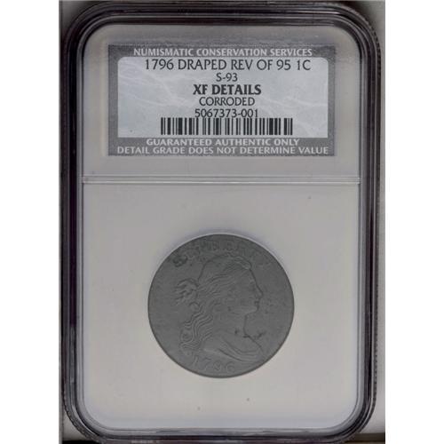 <B>1796<1C> Draped Bust, Reverse of 1796--Corroded--NCS. XF Details.</B></I> S-93, B-34, R.3. This bold medium brown example has been burnished to reduce obverse verdigris, and the left obverse displays faint pinscratches. Thin horizontal marks cross the base of the neck and connect the D in UNITED to the O in ONE. Pits are present on the upper left obverse. EAC 12.