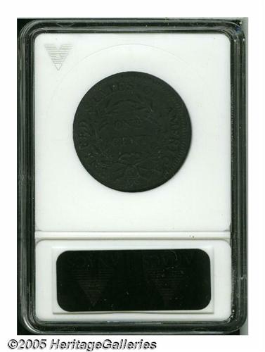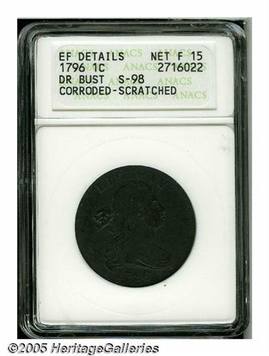 <B>1796<1C> Draped Bust, Reverse of 1796--Corroded, Scratched--ANACS. XF Details, Net Fine 15.</B></I> S-98, R.5. A dark lavender-gray piece with moderately granular surfaces and occasional glimpses of aqua verdigris. A horizontal pinscratch in the field beneath the chin can only be detected beneath a glass. A rare die marriage; Sheldon-93 is the usually encountered Reverse of '96 pairing.