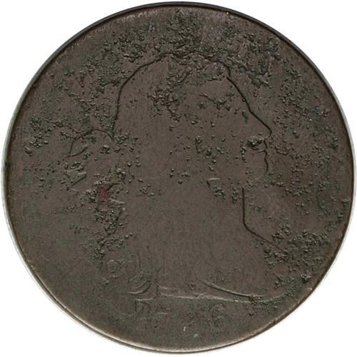 <B>1796<1C> Draped Bust, Reverse of 1796 NC-4, B-23, High R.5--Corroded--NCS. Good Details. AG3 EAC.</B></I> The surfaces show patches of corrosion primarily in the fields although some is found on Liberty's face. Less corrosion on the reverse, and dark brown is the dominant color save for a red speck below Liberty's ribbon. One dull scratch is found below CENT, but the rims, fields and devices are otherwise attractive for the moderate grade. This is one of the few obtainable NC coins.<BR><I>Ex: John Schreuder; Engelhardt; Ray Chatham; Del Bland (5/27/1970).</B></I> Envelope Included.