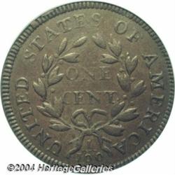 <B>1796<1C> Draped Bust, Reverse of 1797 AU58 PCGS.</B></I> S-119, R.3. Although this impressive chocolate-brown Cent is not fully struck, Liberty's hair has intricate definition, and only a trace of friction is observed on the leaves and portrait. Nearly free from contact, the faint striations that exist were generally on the planchet prior to the strike. A late die state with rim breaks above TA in AT in STATES. Sheldon-119 was part of the Nichols hoard, nonetheless, high quality pieces are under strong demand from type set collectors as well as specialists of the Draped Bust series. Population: 1 in 58, 9 finer (7/04). <BR><BR><B>Important notice:</B> Heritage usually auctions material at the rate of 200-250 lots per hour. On some occasions eBay Live bid software or the Internet may not be able to keep up with the pace of the auction. We recommend placing a realistic absentee bid now as insurance to avoid disappointment. Occasionally the auctioneer may eliminate or reject an eBay Live bid, and the auctioneer may also reopen a lot after the close of the eBay live bidding (usually because we missed an audience bid), and may reject your bid even if it shows you as the winning bidder. By bidding via eBay Live, you agree that Heritage may award the lot to another bidder at its sole discretion under the circumstances described above or any other reasonable circumstances. Since eBay bids are not shown to us until we open the lot on the floor, we treat those bids just like floor bids. In most cases the floor responds before the eBay bid is presented to us, due to Internet lag time, so for consistency we have made it a policy that floor bids are always considered first over tie eBay live bids. Also please note that all Heritage lots purchased through eBay Live carry a 20% Buyer's Premium. Please make sure you read the Terms and Conditions before you bid. </span></font></tr></table></td></tr></table>