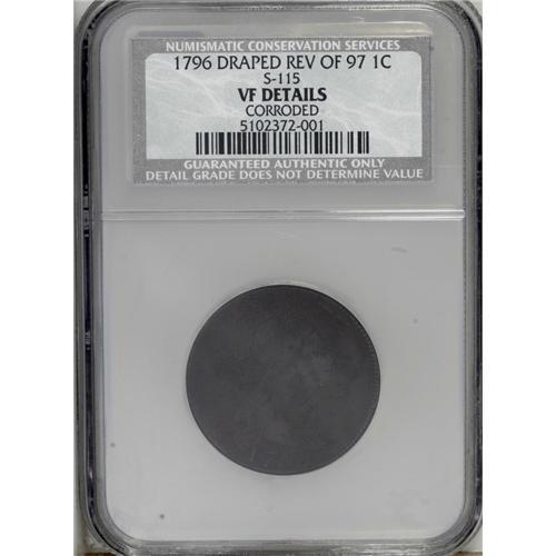 <B>1796<1C> Draped Bust, Reverse of 1797--Corroded--NCS. VF20 Details.</B></I> S-115, B-43, R.3. A dark brown example of this scarce variety. Moderately worn with significant areas of corrosion that obscure some of the letters of LIBERTY. EAC 5.
