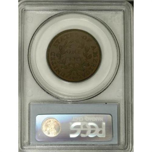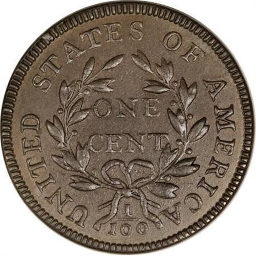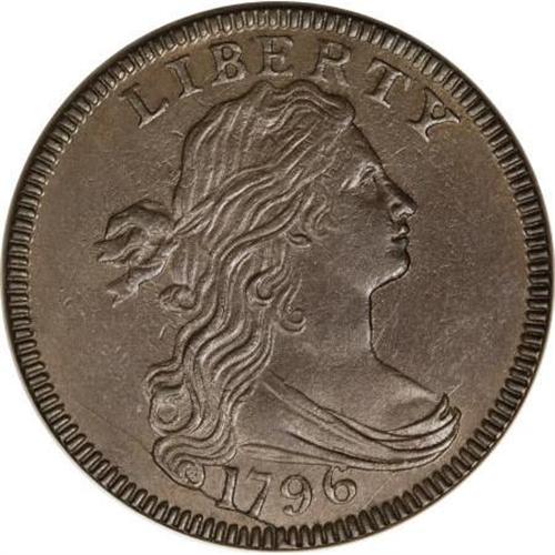 <B>1796 1C Draped Bust, Reverse of 1797. MS63 Brown PCGS. S-119, B-40, R.3. </B></I> <B>Photo #59871. Our EAC Grade AU55.<BR><BR>Equivalents.</B></I> Proskey 18; Doughty 88; Gilbert 15; McGirk 10A; Ross 14K; Clapp-Newcomb 15; EAC 40; <I>Encyclopedia</B></I> 1699; PCGS #1407.<BR><B><BR>Variety. </B></I>Close date with 6 buried in the drapery. Reverse of 1797. Six berries in each branch. The obverse appears on S-118, S-119, and NC-6. The reverse appears on S-119.<BR><B><BR>Surfaces. </B></I>Despite a trace of wear on the highpoints of the obverse and reverse, indicated by pale grayish color on the cheek, shoulder, and wreath, the eye appeal of this coin is outstanding. Little cartwheel luster remains, with reflective fields on both sides. As usual, the upper obverse hair details and the wreath details are a trifle weak. Delightful golden and dark chocolate-brown, slightly darker than the desirable "golden biscuit" look. Perhaps it could be called a "rye biscuit." A nicely centered impression with full, strong borders on both sides.<BR><BR><B>Die State II.</B></I> The obverse has a heavy crack from rim to rim, through the bottoms of 17 and the lowest curl. Faint clash marks can be seen on the obverse, and the reverse has a tiny two-dentil rim break above TA.<BR><BR><B>Census.</B></I> Several Mint State examples of S-119 are known, a result of the Nichols Find. Nearly all such coins have smooth brown surfaces, occasionally with traces of original red. Rarely are pieces found with substantial red color.<BR><BR><B>Commentary.</B></I> Grading is an art form that leaves open much room for interpretation and differing systems. Because of the trace of wear, the EAC grade of this example is AU55. It is purely a technical assessment. The PCGS grade of MS63 Brown, a commercial grade, attempts to assess the market desirability of the piece. Even though the coin does have a trace of wear, it is still more desirable than many others that are strictly Mint State but less appealing. Keep in mind that these are two entirely unrelated grading systems, one interpreting the technical quality of the coin, the other assessing the market value.<BR><BR><B>Provenance.</B></I> <I>Purchased at the September 1986 Long Beach Convention; John D. Wright; Chris Victor-McCawley (2/2006).</B></I><BR><BR><B>Personality.</B></I> The <B>Nichols Find</B></I> was an accumulation of 1796 and 1797 large cents, all Mint State, including 1796 S-119, 1797 S-123, and 1797 S-135. The coins were said to be acquired by Benjamin Goodhue of Salem, Massachusetts, directly from the Mint. He passed the hoard to his daughters, and the coins were eventually acquired by David Nichols of Gallows Hill, Massachusetts, in 1859.<BR><BR><b>Shipping:</b> Coins & Currency (<a target="_blank" href="http://www.heritageauctions.com/common/shipping.php">view shipping information</a>)