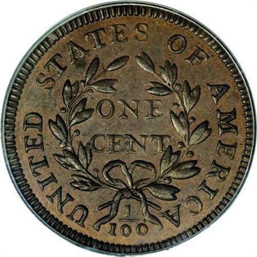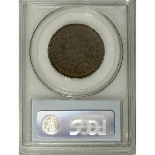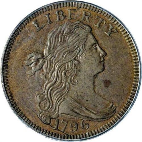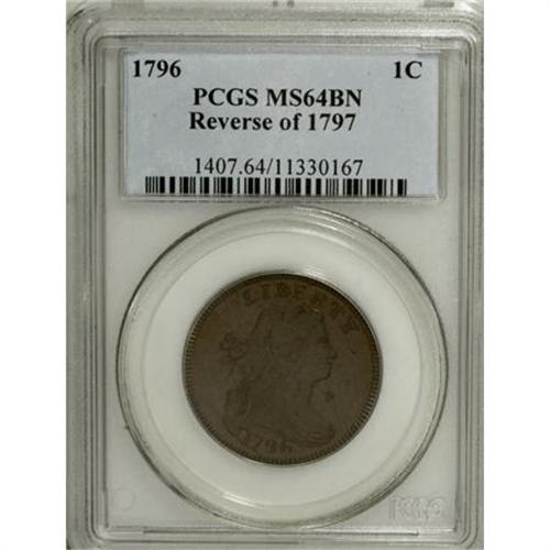 <B>1796 1C Draped Bust, Reverse of 1797 MS64 Brown PCGS.</B></I> S-119, B-40, R.3. Breen Die State II with light clash marks on the obverse. The small break above the TA in STATES joins two dentils, but no trace of the additional break above AT has formed. A short but bold die line through the upper leaf tip opposite the R in AMERICA also confirms this popular "Nichols Find" marriage. The 6 is entered too high, and its knob partly overlaps the bust truncation.<BR> This is a beautiful tan-brown piece with well struck borders and evenly impressed devices. The satiny surfaces are unperturbed, aside from a small medium brown spot in the field southeast of Liberty's chin, and an even more subtle maroon spot beneath the A in STATES. EAC 60.<BR><BR><B>Coin Engraver:</B> Robert Scot<BR><BR><b>Shipping:</b> Coins & Currency (<a target="_blank" href="http://www.heritageauctions.com/common/shipping.php">view shipping information</a>)