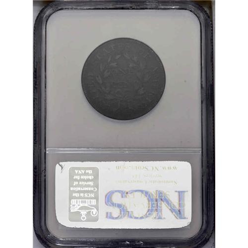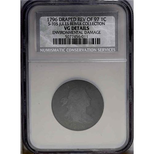<B>1796<1C> Draped Bust, Reverse of 1797. S-105, B-44, High R.5--Environmental Damage--NCS. VG Details. Good 5 EAC.</B></I> Rather heavy corrosion with ebony surfaces exhibiting a slightly greenish tint. This example appears to be an earlier die state.<BR><I>Ex: Lipka (4/25/1970).</B></I> Envelope Included.
